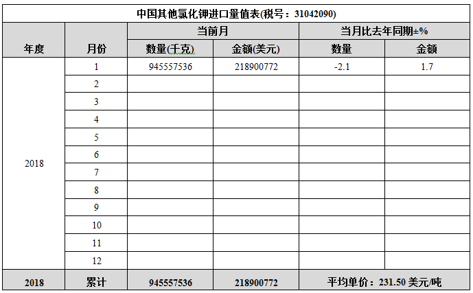 2018年1月份,中國(guó)其他氯化鉀進(jìn)口量為94.56萬(wàn)噸,金額總計(jì)218900772美元,平均單價(jià)231.50美元/噸。上月進(jìn)口量為60.64萬(wàn)噸,環(huán)比增加55.9 %。2017年同期進(jìn)口量為96.58萬(wàn)噸,同比減少2.1%。