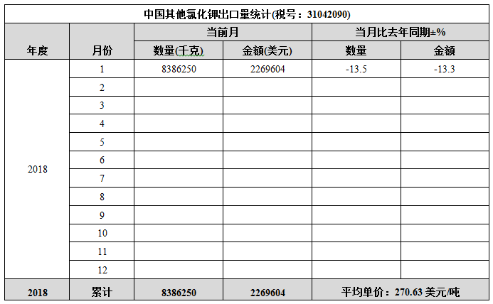 2018年1月份,中國(guó)其他氯化鉀出口量為8386.25噸,金額總計(jì)2269604美元,平均單價(jià)270.63美元/噸。上月出口量為20309.14噸,環(huán)比減少58.7%。2017年同期出口量為9694.20噸,同比減少13.5%。
