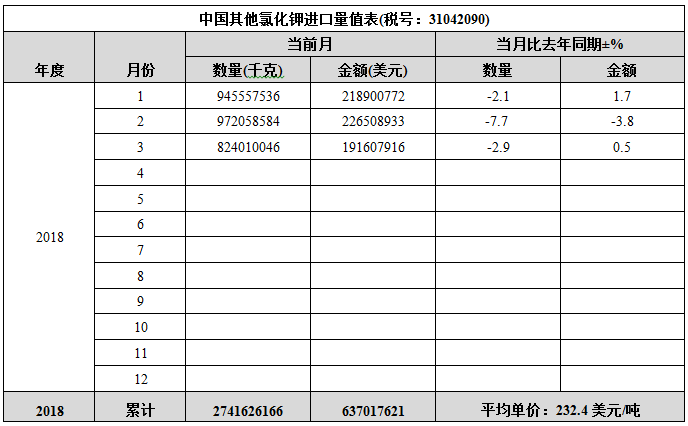 2018年3月份中國其他氯化鉀進(jìn)口量為82.40萬噸,金額總計(jì)191607916美元,平均單價(jià)232.53美元/噸。上月進(jìn)口量為97.21萬噸,環(huán)比減少15.2%。2017年同期進(jìn)口量為84.87萬噸,同比減少2.9%。