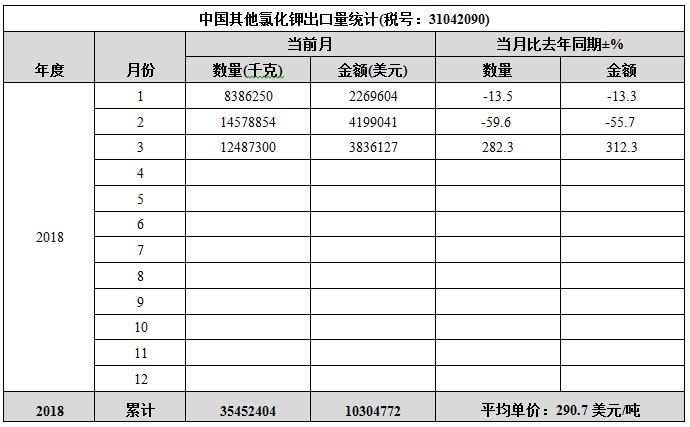 2018年3月份中國其他氯化鉀出口量為1.25萬噸,金額總計(jì)3836127美元,平均單價(jià)307.2美元/噸。上月出口量為97.20萬噸,環(huán)比減少14.1%。2017年同期出口量為0.32萬噸,同比增加282.3 %。