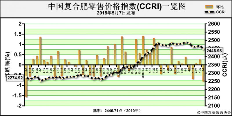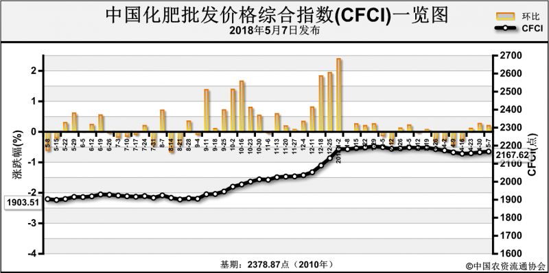 近期(4月30日-5月4日),中國化肥批發(fā)價格綜合指數(shù)連續(xù)上漲。5月7日中國化肥批發(fā)價格綜合指數(shù)(CFCI)為2167.62點,環(huán)比上漲4.13點,漲幅為0.19%;同比上漲256.03點,漲幅為13.39%;比基期下跌211.25點,跌幅為8.88%。5月7日中國復合肥零售價格指數(shù)(CCRI)為2446.98點,環(huán)比下跌20.58點,跌幅為0.83%;同比上漲156.58點,漲幅為6.84%;比基期上漲0.27點,漲幅為0.01%。