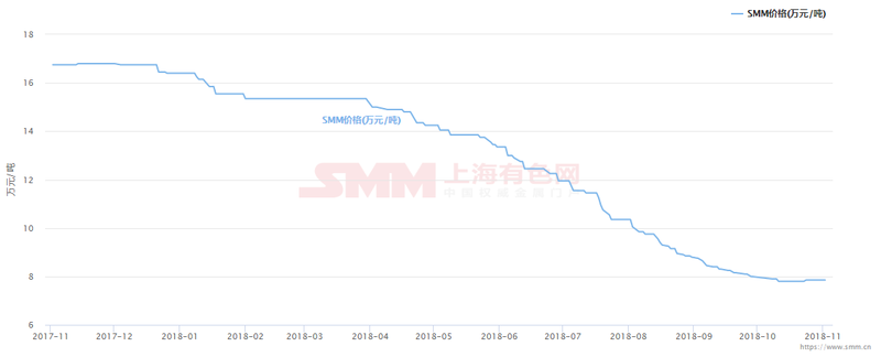由于鋰需求增速不及供應(yīng)增速,今年前三季度鋰價(jià)持續(xù)走低,碳酸鋰相較于年初1月的16.4萬元/噸,如今(11月)已跌至7.85萬元/噸,跌幅達(dá)52.13%。氫氧化鋰也同樣從1月的14.85萬元/噸跌至11月初的12.3萬元/噸,跌幅達(dá)17%。